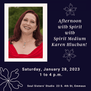 Join international Spirit Medium Karen T. Hluchan for a special gallery reading for 12 people at Soul Sisters’ Studio in Emmaus, PA! In this small group setting at this beautiful historic location, each person in attendance will receive direct messages from loved ones in spirit or the angels.